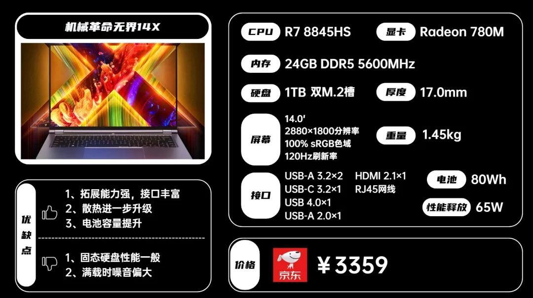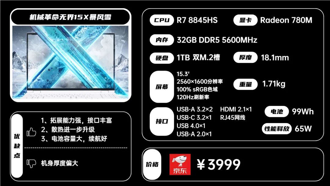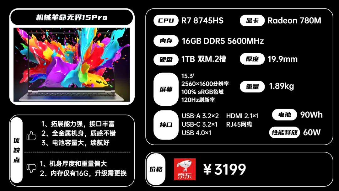 无界15Pro最便宜,3000出头买到8745HS的配置,这个CPU是8845H降频,砍了NPU单元,对日常使用影响不大,散热和屏幕都不错,全金属机身,不足之处就是重量偏大,接近2kg;