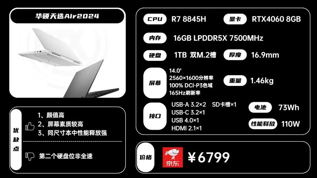 第二款就是华硕天选Air了,14寸全能本佳作,R7 8845H+4060显卡的配置,补贴后仅需6799元,兼具轻薄本的便携性和游戏本的配置,非常适合大学生或者有游戏需求的工作党选择。如果需要建模、渲染、多开什么的比较吃CPU,还可以选择AI 9 HX370处理器的版本,CPU性能提升明显。