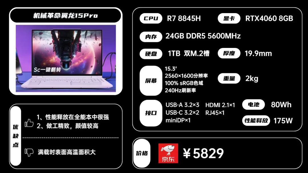 全能本首推机械革命翼龙15Pro,R7 8845H+4060显卡的配置补贴后5800多,这个模具做工不错,没有鸡哥游戏本那种粗糙感,白色外观更显精致,带去商务场合也不违和,性能释放也做得不错,性价比高。