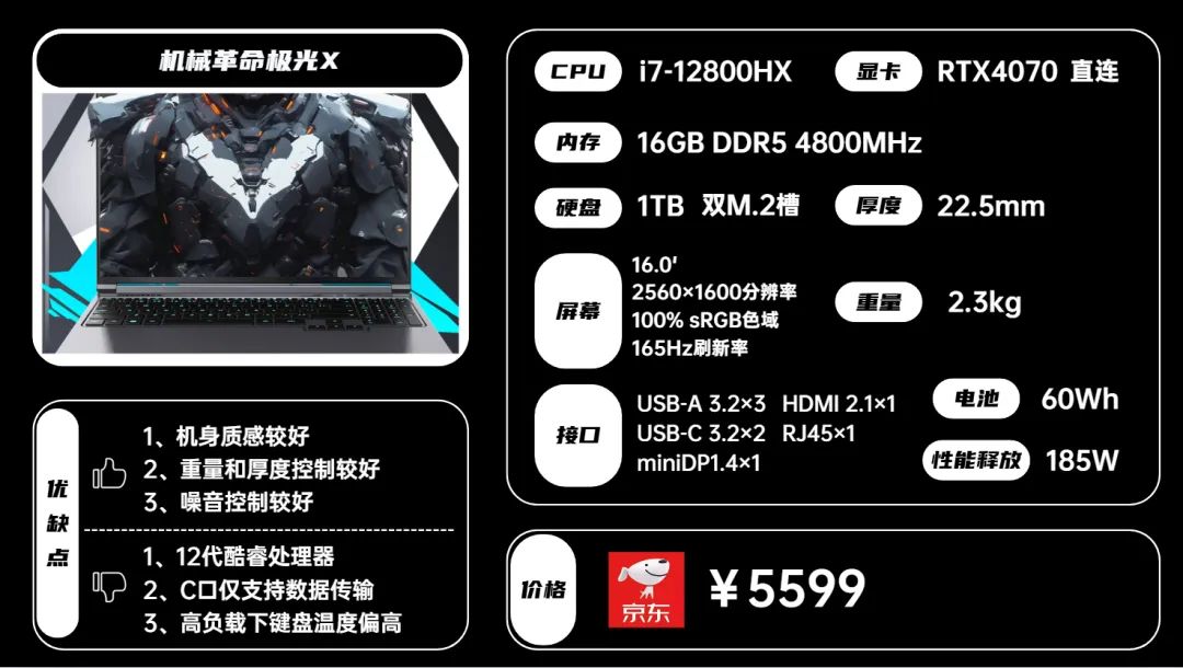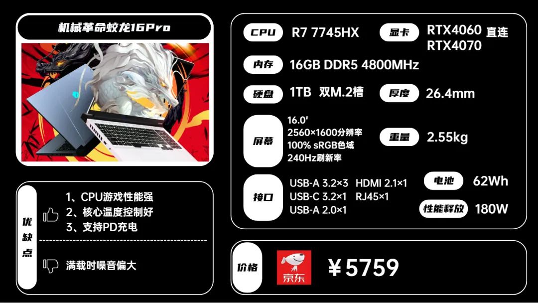 蛟龙16Pro也不错,R7 7745HX+4070显卡的配置,补贴后5700多元,相比于极光X,它更厚,更重一些,但是表面温度控制更好。