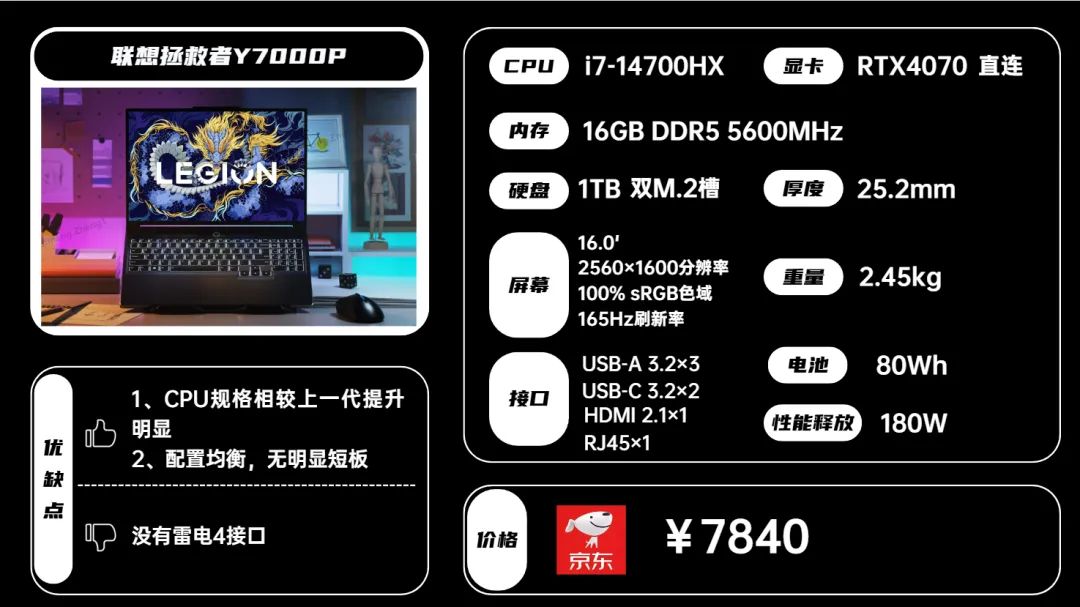 如果要买一线品牌的游戏本,可以看看拯救者Y7000P,i7-14700HX+4070显卡的配置,补贴后7800多元,六边形战士,没啥明显短板,散热在同价位几款一线品牌的机型中比较突出。