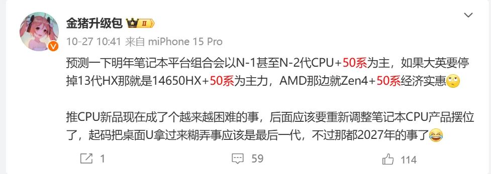 和往年一样,50系移动端显卡和CPU的更新并不完全同步,根据爆料消息,明年会有一批搭载老CPU,比如13代、14代HX,或者Zen4架构的锐龙8000、锐龙7000HX,和50系显卡的新本子上市。后面才是Arrow Lake-H,或者Zen5架构APU去搭配50系显卡。