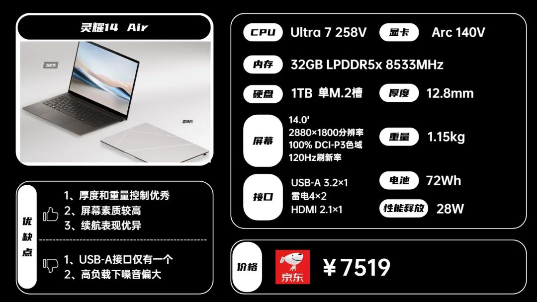 高价位轻薄本我个人比较推荐华硕的灵耀Air 14,这是第一款搭载Ultra 200V处理器的产品,补贴后7500元,续航超长,屏幕和重量控制都做得不错,适合经常外出携带的朋友。