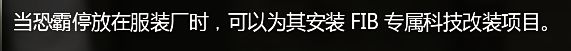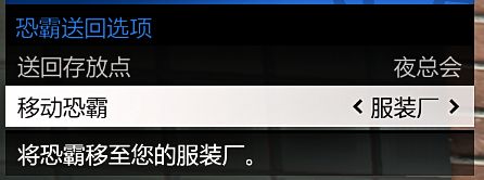 服裝廠有可以用於存放恐霸的空間,並且可以改裝上“FIB技術”。您可直接通過(M鍵)互動菜單-服務載具-恐霸-送回選項,足不出戶將您的恐霸移動至服裝廠