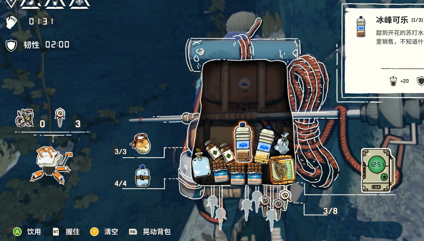 游戏既然带有生存元素,物品管理也十分重要:食物,水,药品都是在岩壁上存活的必需品;岩钉,防滑粉,缠手带是登顶的保证。