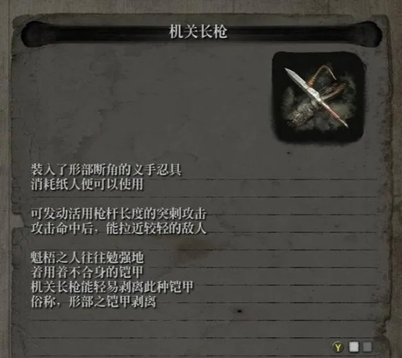 按下RT可以進行突刺,再按下RT以把敵人拉回來的。這個技能能把某些怪物的不合算盔甲直接拽下來 ,比如說: 用鈡做武器的太郎兵,我們可以直接拽掉他的貞操帶。 還有內府的重藏這個精英怪也是可以拽掉它的護甲的。 甚至打無頭獅猿 的時候可以把裏面的蜈蚣拽出來 造成一個非常大的軀幹傷害。要速刷獅猿 機關長槍必備。機關長槍有兩種:在蓄力的時候 第一種進行一個長距離的突刺技能,造成一定的傷害和招架值,是一個性價比非常高的技能,只消耗1個紙人, 因爲這個技能攻擊距離非常長 可以作爲一個先手技能。另外一種長槍 蓄力之後可以大範圍橫掃,打櫻龍的第一階段是很好用的,升級到最高級的火舌 消耗2個紙人 大範圍橫掃的同時造成一個火炎傷害。我這裏非常推螺旋號,多段傷害, 清小怪,打BOSS都可以用 ,一次只消耗一個紙人 。蓄力之後可以前衝一段距離 有位移 ,是一個非常好的先手手段, 性價比之王。