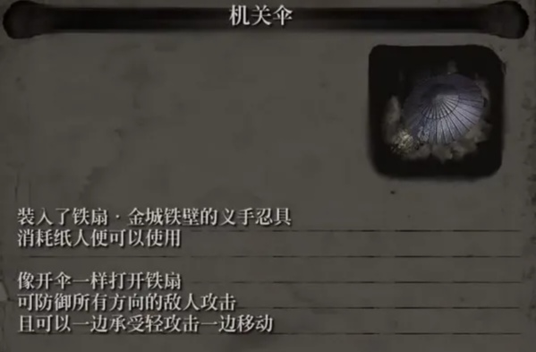 衆所周知只狼中沒有盾牌,很多黑魂持盾癌玩家在只狼中瘋狂受苦,沒有盾牌這個遊戲怎麼玩? 別急老賊給我們留了後門,就是這個機關傘,它的存在甚至比大盾更加IMBA。按下RT的瞬間有個彈反判定可以造成一個大量的肢幹傷害也就是架勢條。 然後按住RT就是撐着傘遊戲裏稱作避雨 。可以抵擋輕攻擊,但是會增加我方的架勢收到重傷害會破防。當避雨的時候按下LB也就是格擋鍵可以轉傘,在傘轉的過程中敵人攻擊你會對其造成一個比較大的肢幹傷害。 (撐傘消耗一個紙人 每轉傘一次再消耗一個紙人,)很多攻擊頻率高敵人我們只要跟着他的攻擊節奏轉傘就能把他的架勢條迅速累計滿,然後可以直接斬殺。在撐傘的過程中,點了忍義肢的天賦之後再按攻擊鍵會使出一個十字斬。這個十字斬的傷害取決於你傘吸收了多少傷害。當你的傘冒煙的時候就說明下次十字斬可以造成一個額外傷害。 當你累計足夠傷害 甚至可以一擊必殺。 傘有3種類型 :一種是磁鐵軸機關傘 吸收物理傷害 。鳳凰紫青傘 吸收怨靈傷害。朱雀紅蓮傘 吸收火系傷害。機關傘基本上能擋住絕大數傷害,但是危的下段的橫掃攻擊是防禦不了的。還有一點就是傘有一個BUG 比如裏使用了神之飛雪給武器附魔之後你再使用紫傘會讓FM效果貌似消失。