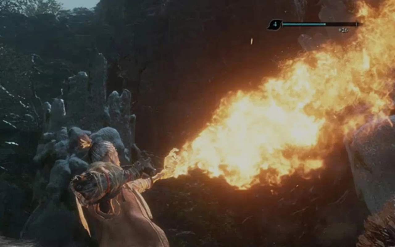 噴火桶是一個很實用的義肢了。但是需要配合忍術的被動技能奧義附牙斬才能體現出他的威力。使用噴火桶之後馬上按攻擊會給刀附上火焰效果 雖說時間不長 但是連續砍能砍出 7,8刀的樣子。如果能觸發炎上效果,敵人出大僵直 連續的砍殺能造成一個巨大的傷害。噴火筒有3種使用方式 :清按RT 。重按RT,這裏重按RT的會有一個很大的後坐力,這裏我比較推薦輕按馬上接攻擊。 噴火桶的距離相對較近,攻擊前搖大 是一個後手技能,打那些肉盾型的不會格擋的怪效果是非常好的,火牛 赤鬼 獅猿 破解僧 等對紅眼怪有奇效。但是打會格擋的敵人效果就會比較差,攻擊全部被格擋,火焰效果就大大的減弱了。 第三種使用方法就是持續噴火,按下RT之後再按住RT 持續噴火, 但是紙人消耗實在太高了只能爽一會 燃料就沒了。
