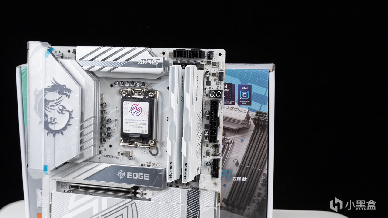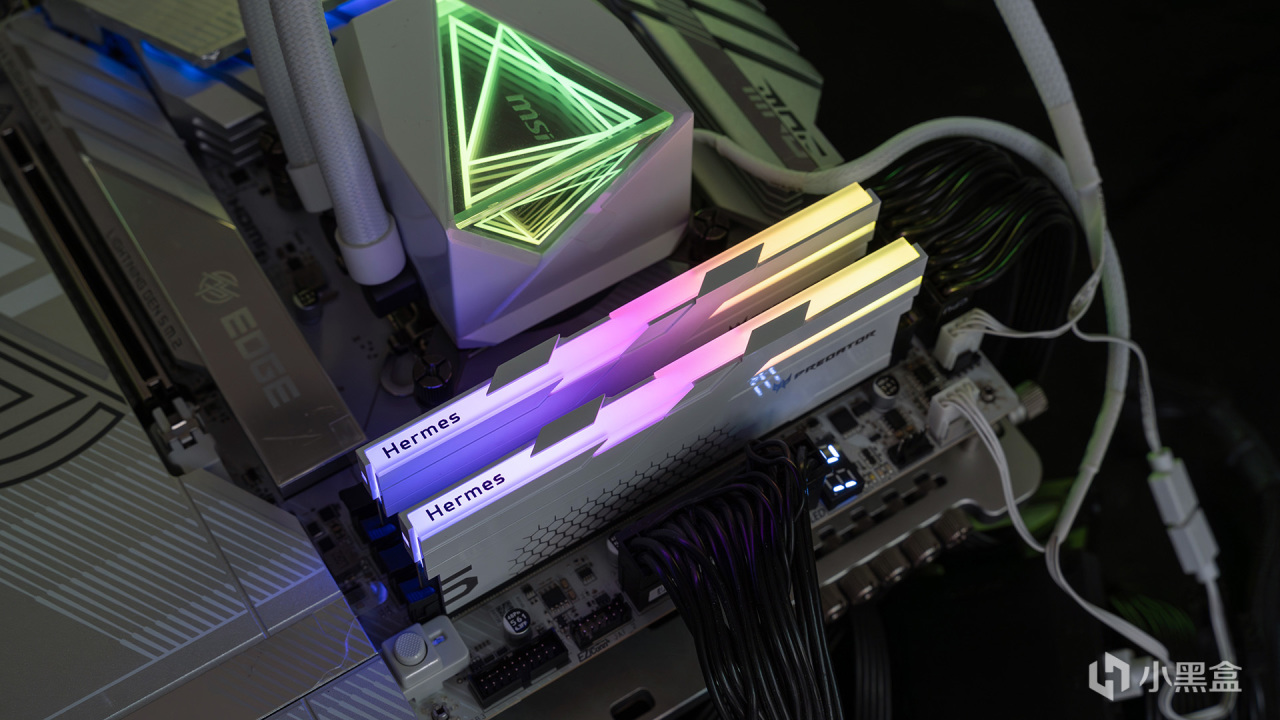 Hermes冰刃 RGB DDR5 8400C40实装效果,和同样白色的Z890刀锋钛还是相当搭衬的,另外这款内存马甲高度达到了夸张的51.76mm,意味着更大面积的散热面积,不过玩家们不必担心兼容性问题,目前最新的旗舰风冷都有做人性化避让处理。