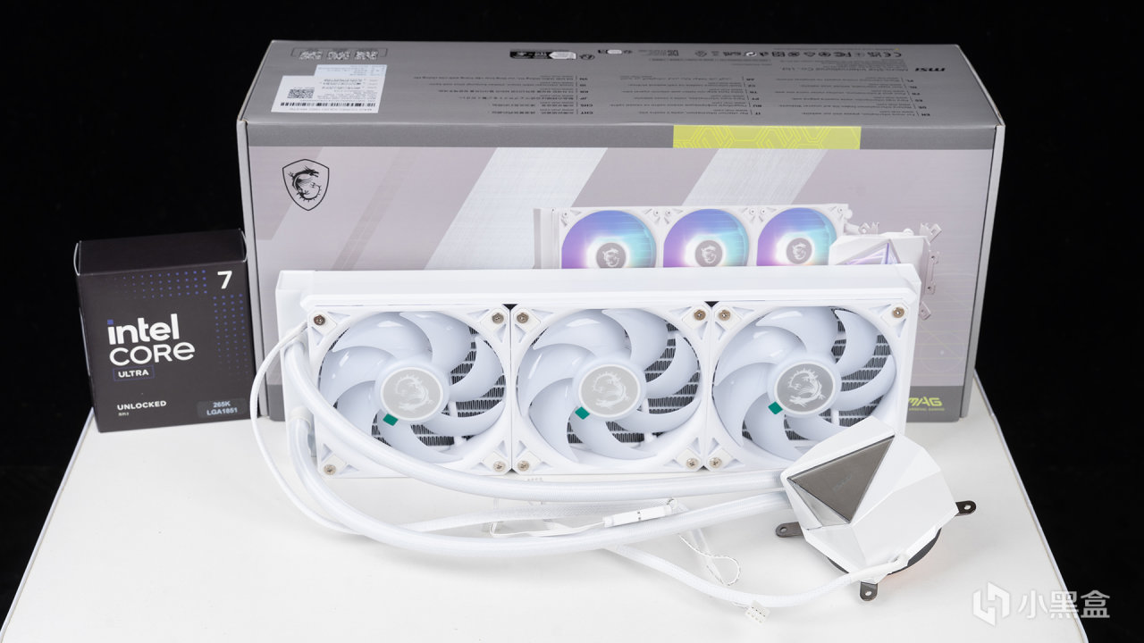 测试CPU是Intel Core Ultra 7 265K,为了更好发挥CPU性能进行测试,用的是微星MAG CORELIQUID I360 WHITE寒冰这款水冷,外观亮点是采用耐看且有美感的双面无限镜冷头,性能方面,铜底优化、LGA 1851偏移扣具等设计可以更好压制新一代Ultra处理器。它也有不少DIY人性化设计,比如冷排风扇遮线、出厂预装风扇等。