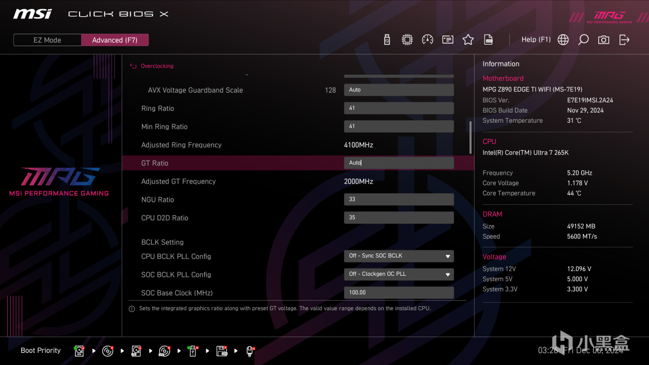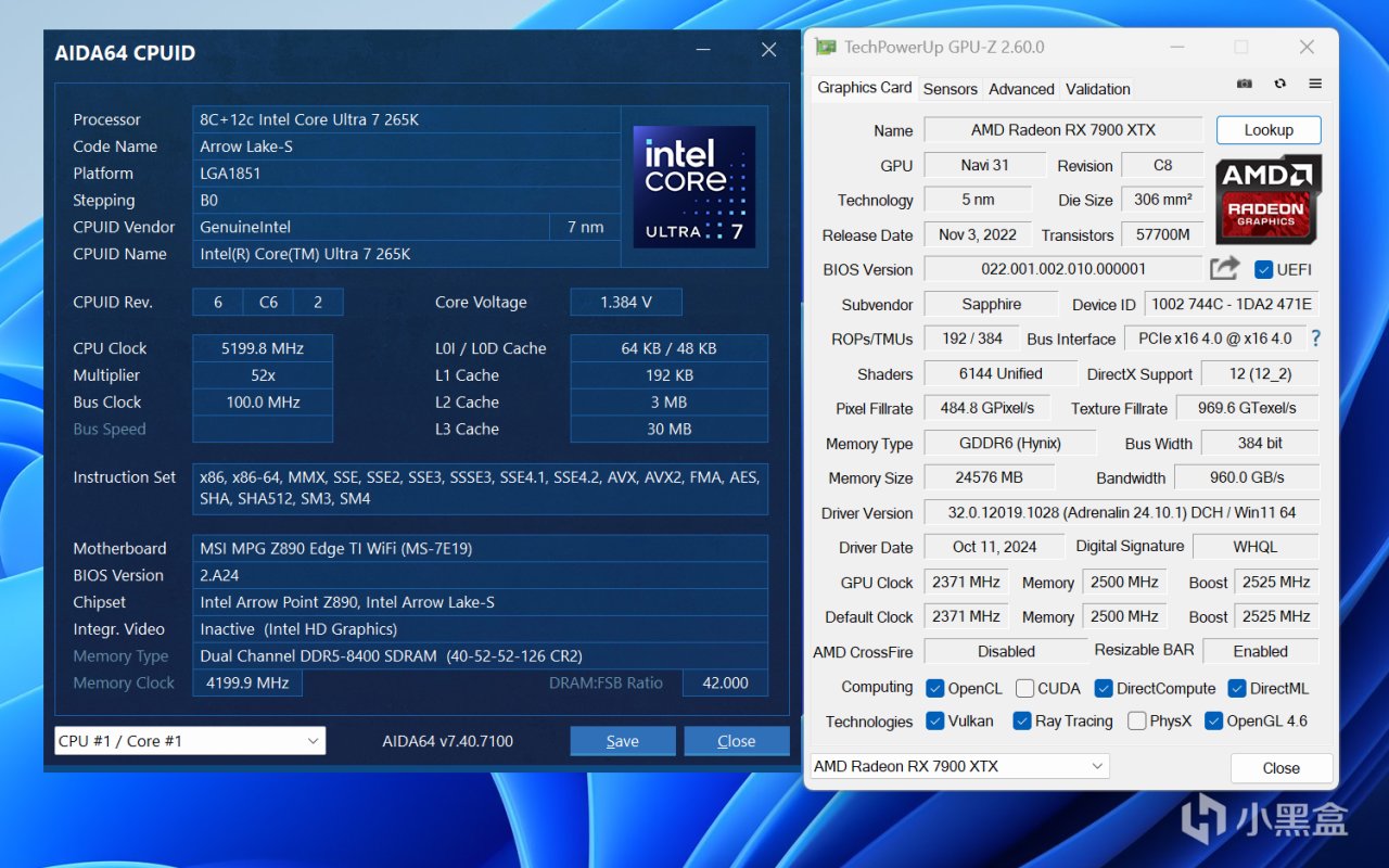 折腾内存之前来过一遍测试环境,处理器就是Core Ultra 7 265K,BIOS内解锁所有功耗限制,Z890刀锋钛主板刷新至7E19v2A24最新BIOS版本,支持0x112微码。显卡则是用到旗舰级的RX 7900 XTX 24GB,主要是用来对比一下超频前后的帧数表现,搭载的是Windows 11 24H2最新系统,裸机测试室温大约22℃。