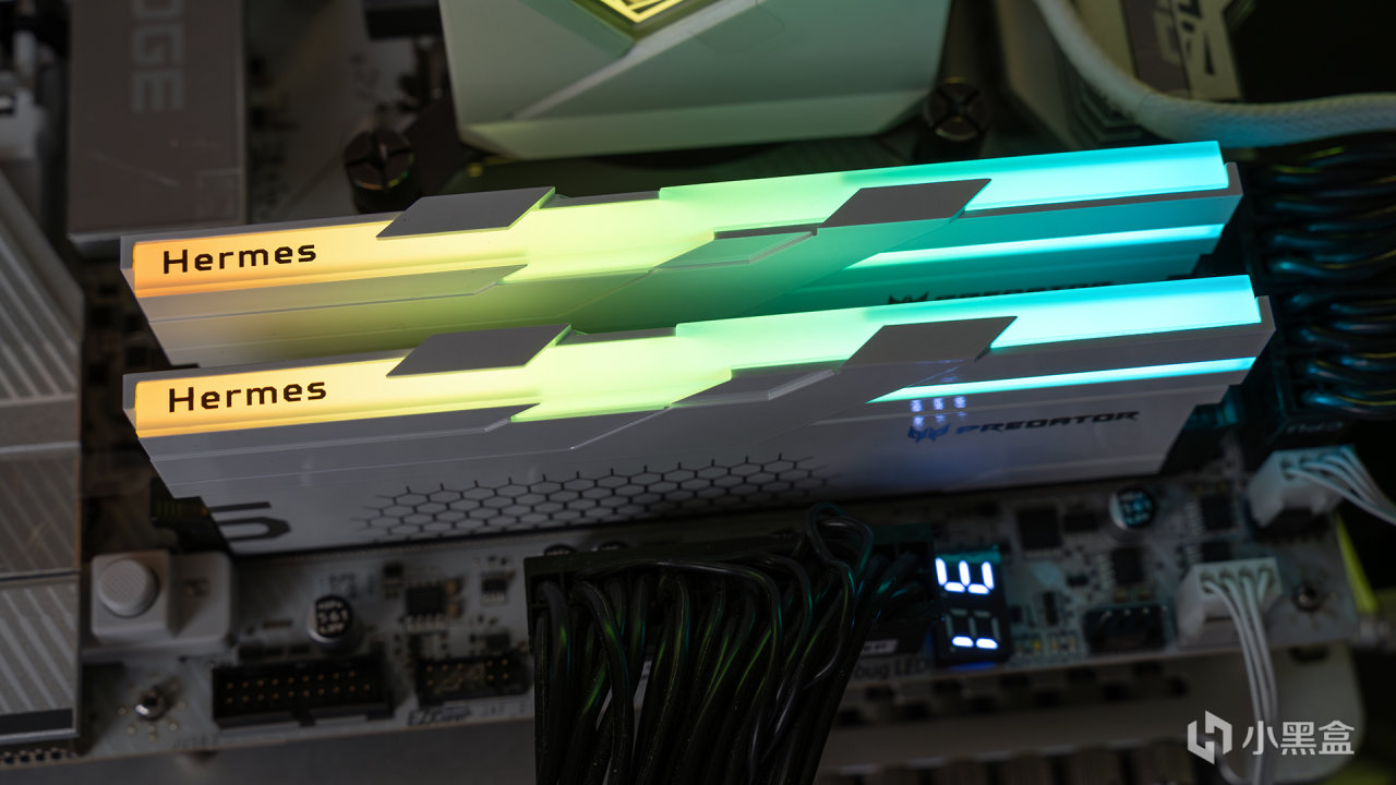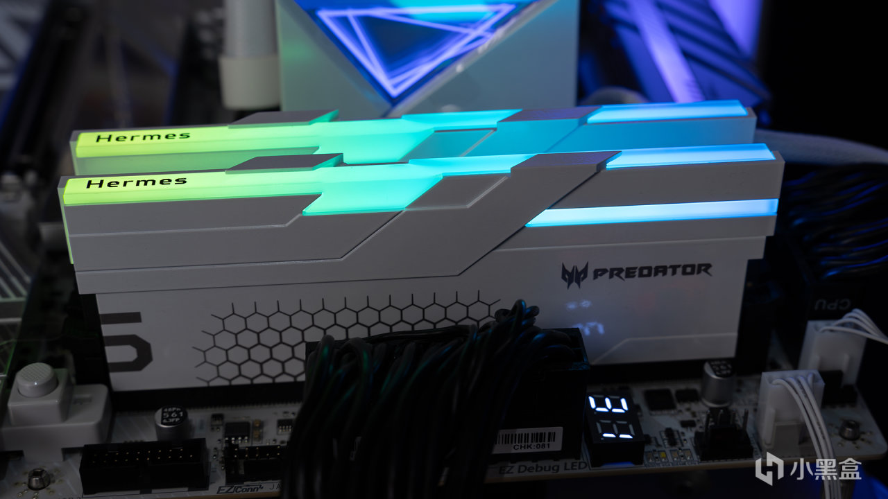 Hermes冰刃 RGB DDR5 8400C40侧面灯效效果也不错,能看到因为堆叠结构,灯光秀就是无死角的~