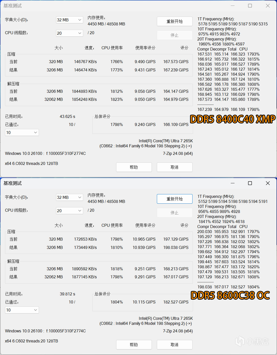 7-ZIP基准测试,手动超频最为显著的提升就是压缩方面,评分相比XMP方案提升幅度足足达到18.5%,而解压缩提升1.8%,更多关联CPU本身的多线程性能,可见手动超频后效果就会直接反映在生产效率上。