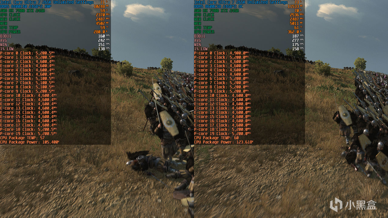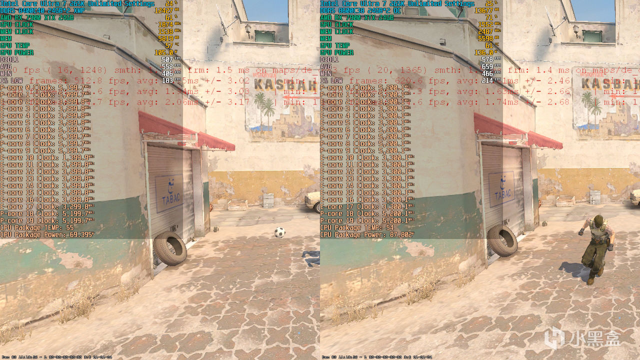 最后在游戏项目方面,由于手动超频内存延迟得到大幅度改善,三款测试游戏平均帧率和1% LOW帧均有不小幅度,对于内存性能敏感的《Counter-Strike 2》最大甚至可达到19%提升幅度,可见这一代Ultra处理器内存性能确实相对瓶颈了一些,如果你也在用Ultra处理器,强烈建议手动超频一下内存效果更佳。