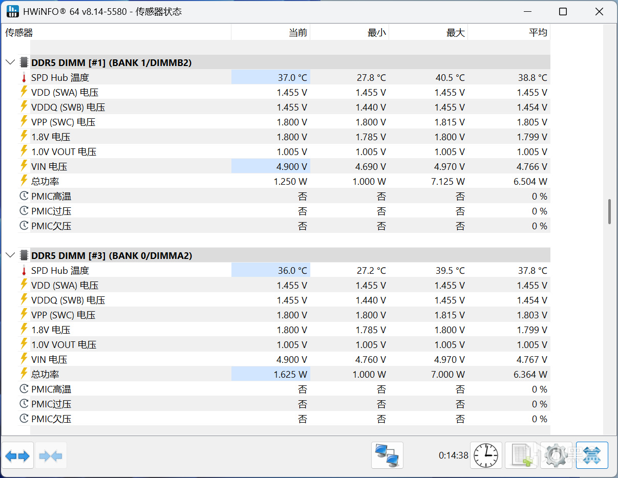 手动超频后在TestMem5烤机时,使用额外的风扇辅助,可以看到这套冰刃内存最高温度分别只有36℃、37℃,对于大众玩家来说,1.6V以下风冷辅助足矣,何况这只是1.45V。