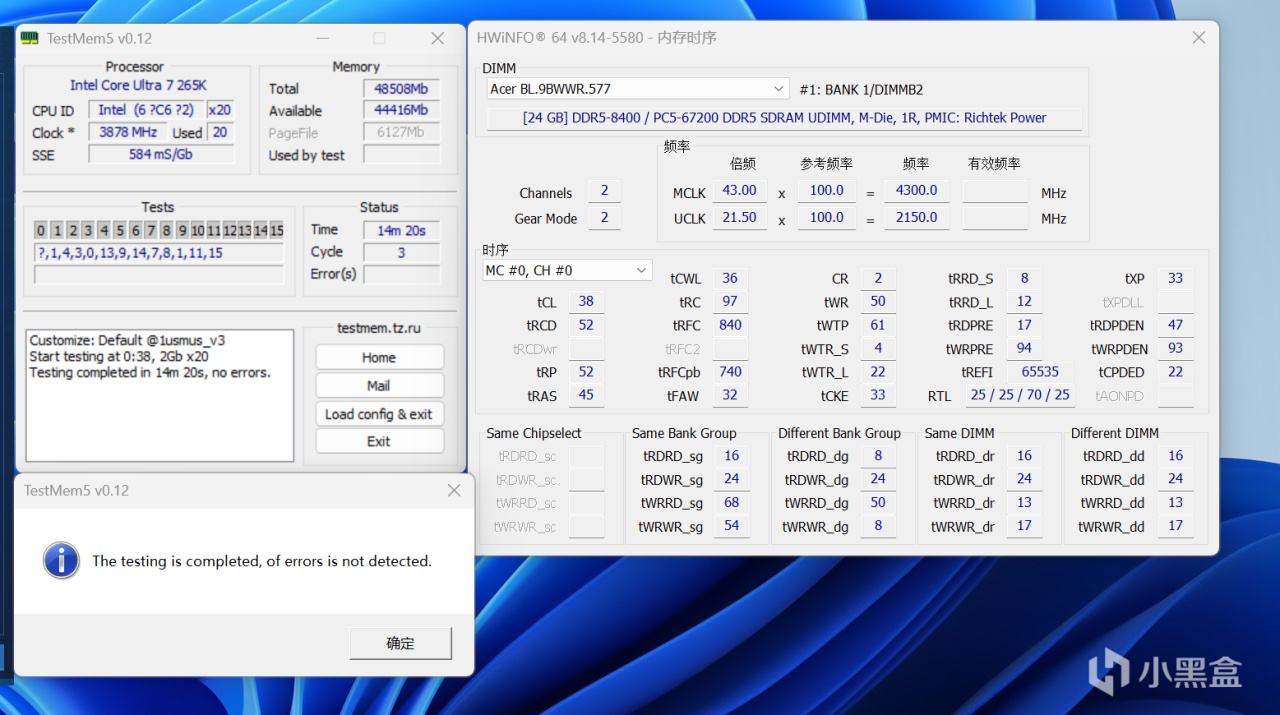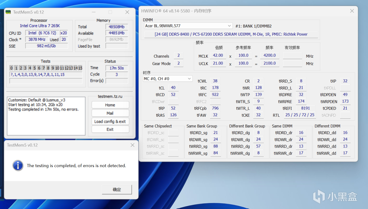 这颗Ultra 7 265K IMC属于合格体质,经过一番折腾,在Gear2模式下,最终能达成通过TestMem5 1usmus_V3配置烤机的频率是DDR5 8600C38-52-52-45,副时序和第三时序都可以比XMP方案更为缩紧,参数上来看是属于宽松点的调教。内存电压仅需1.45V,对于M-Die(3Gb)颗粒来说使劲电它不是个好方案,刚刚合适才是最好,另外就是CPU VDD2和SA这两个电压,对于Ultra处理器超内存来说至关重要。