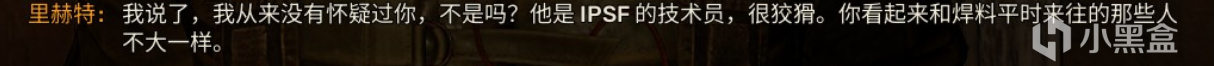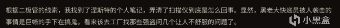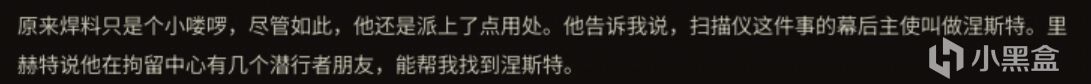幫助老爹和守望找到兇手後,主角如願以償得到了信息,並且找到了焊料,發現焊料只是一個跑腿的小嘍囉。