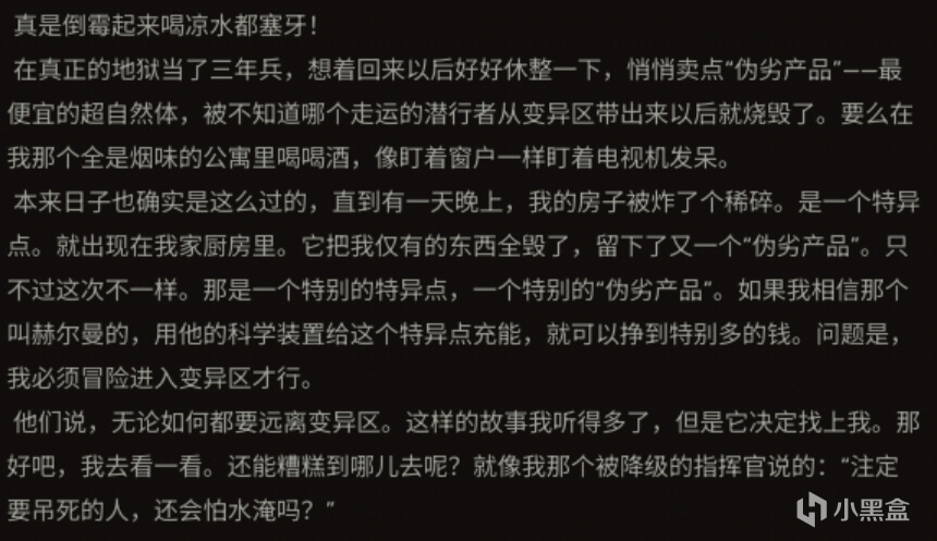 那位倖存者便義無反顧地進入了變異區中,成爲了一名【潛行者】。