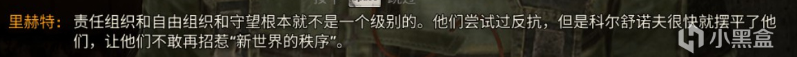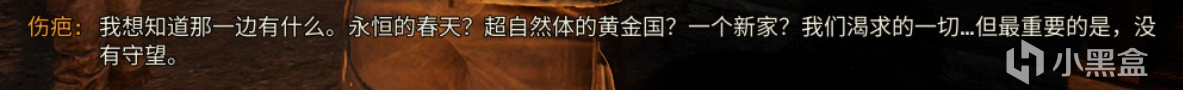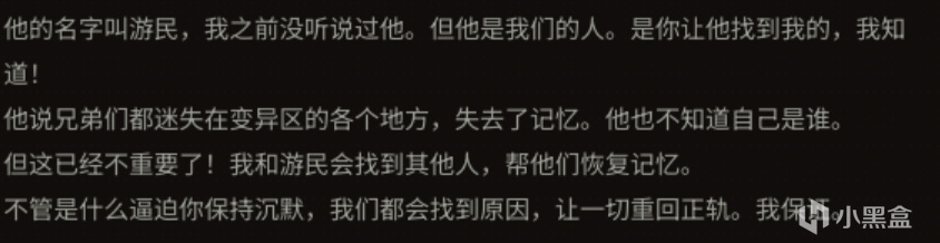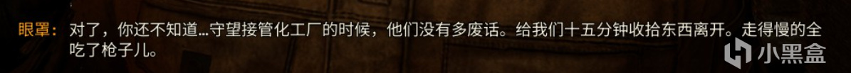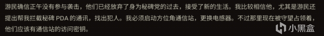 正午的領袖遊民給了主角一個肯定的答覆,他們沒有襲擊主角,他們已經不再是黑石的士兵,而是懷着悔悟度過餘生的普通人。
