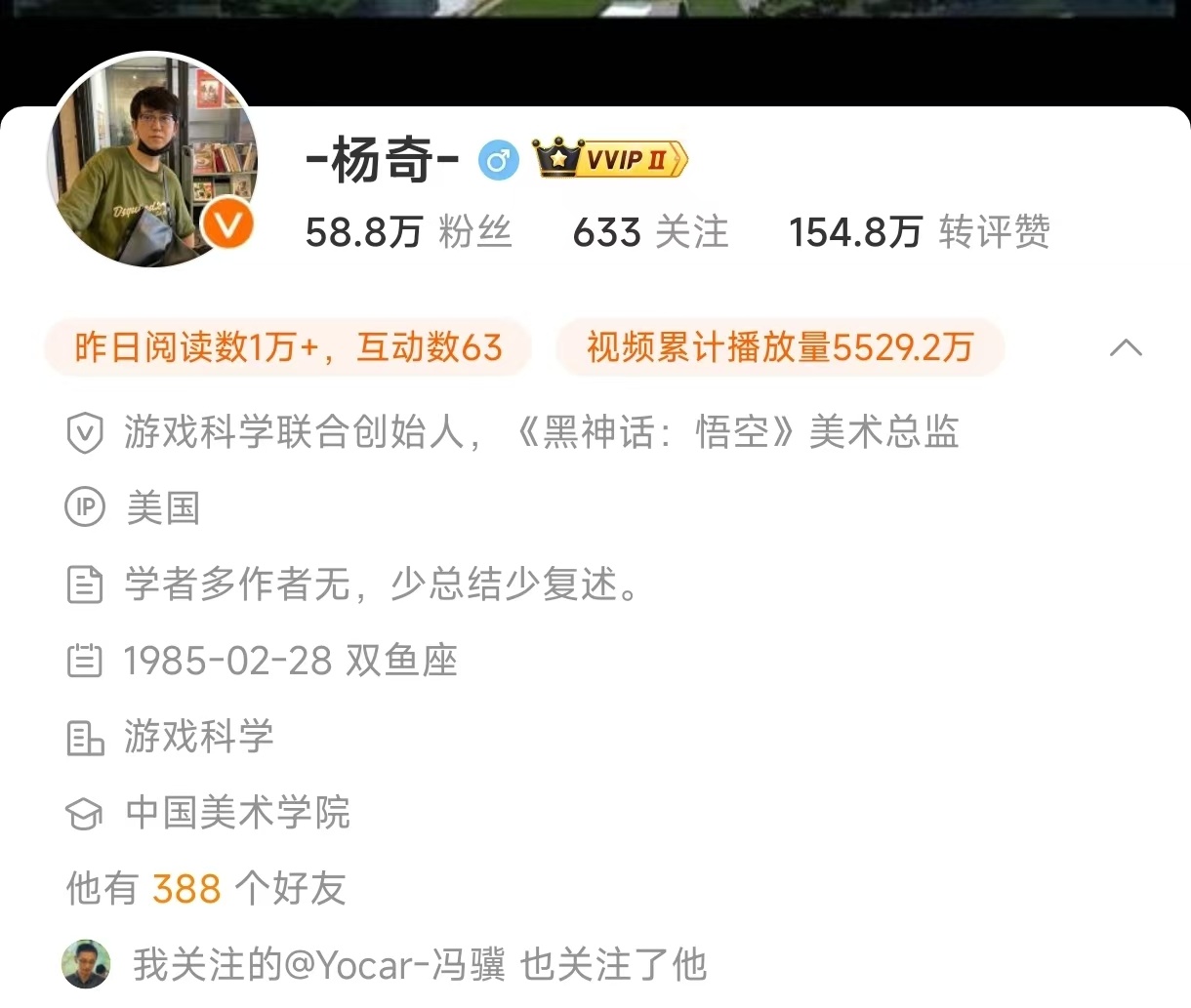五、《黑神話:悟空》楊奇微博IP顯示爲美國!玩家:來TGA了?