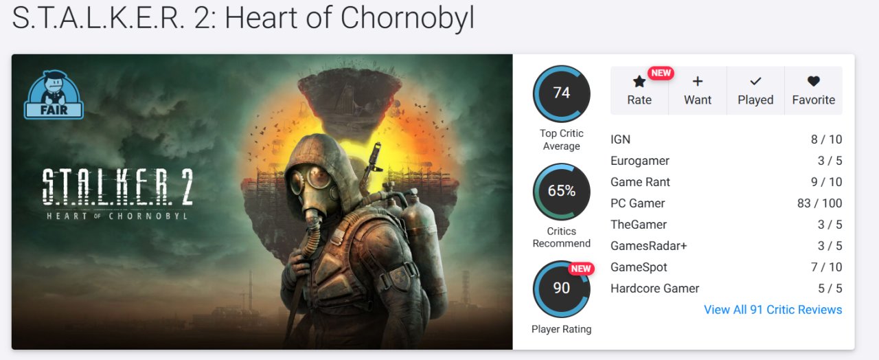 游戏在不到 48 小时内便突破了百万销量,多家媒体对其称赞有加,IGN给出了8分,oc评分目前是74分。