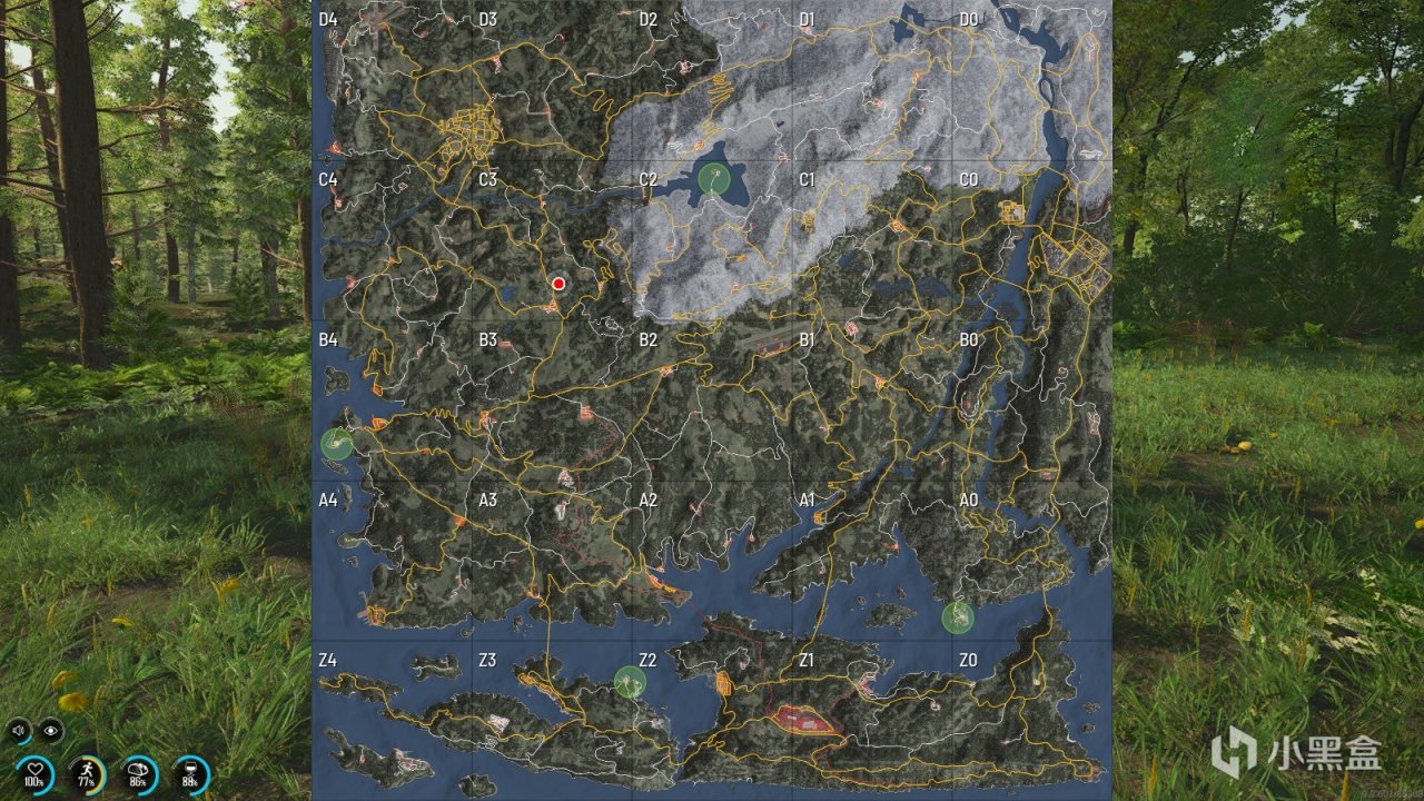當我查看地圖的時候,發現地圖標註的很詳細,標註了A1-A4,直到D1-D4,一共有十六塊區域。每一塊區域都有軍事基地,紅色的點則是角色當前的位置。