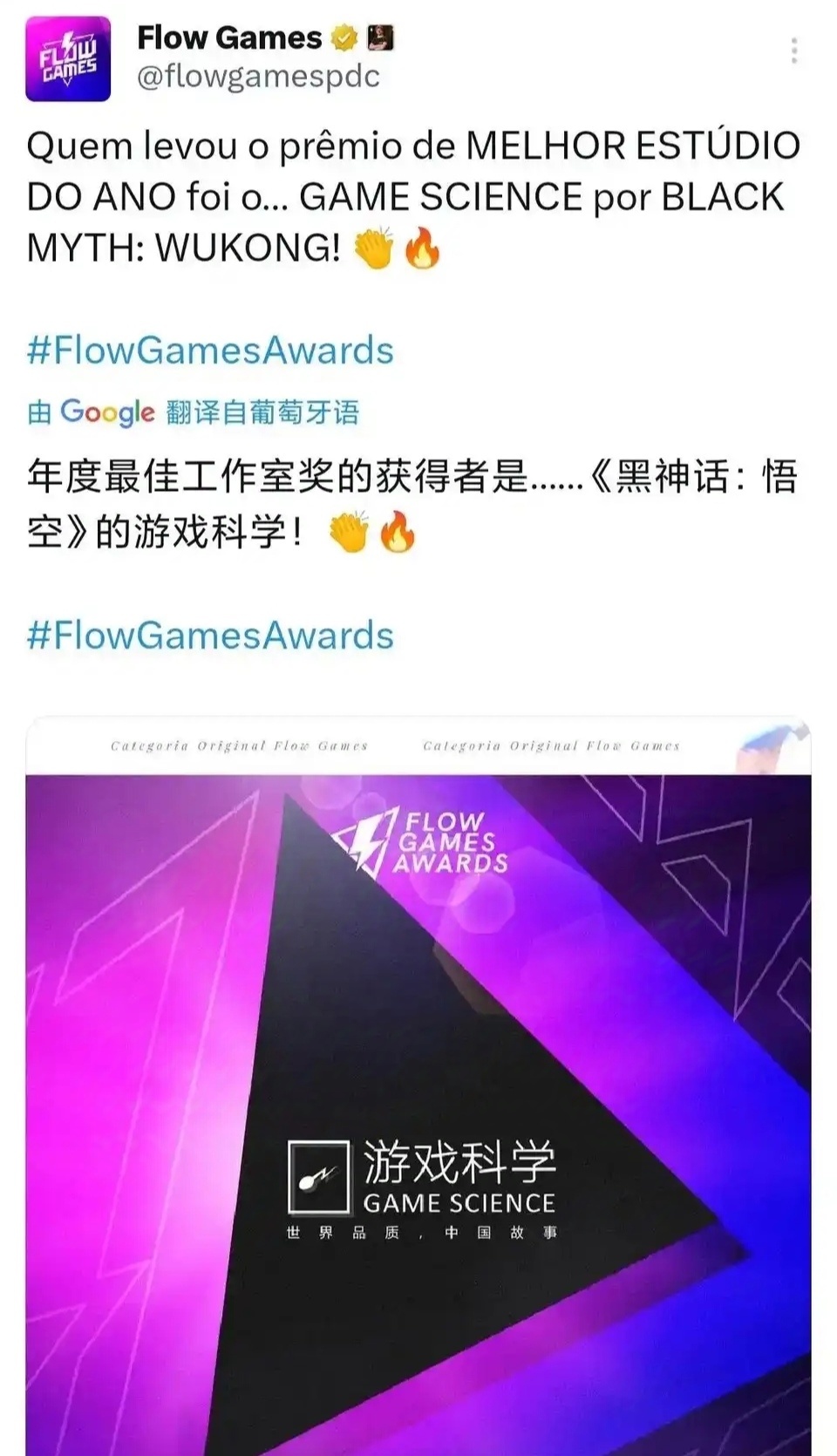 巴西遊戲媒體——流動遊戲(Flow Games)宣佈黑神話悟空獲得了2024年Flow Games年度遊戲大獎,並且還獲得了最佳動作冒險遊戲