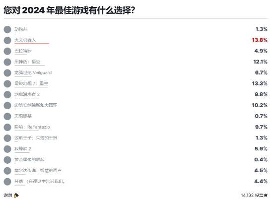截止发稿时,官网显示已有14192名玩家参与年度最佳游戏投票。目前排名第一的是《宇宙机器人》,有13.8%玩家支持。《黑神话:悟空》虽然排名第三,但是票数与前两名的差距很小,完全有希望追赶第一名。你预测哪款游戏能拿下IGN年度最佳呢?