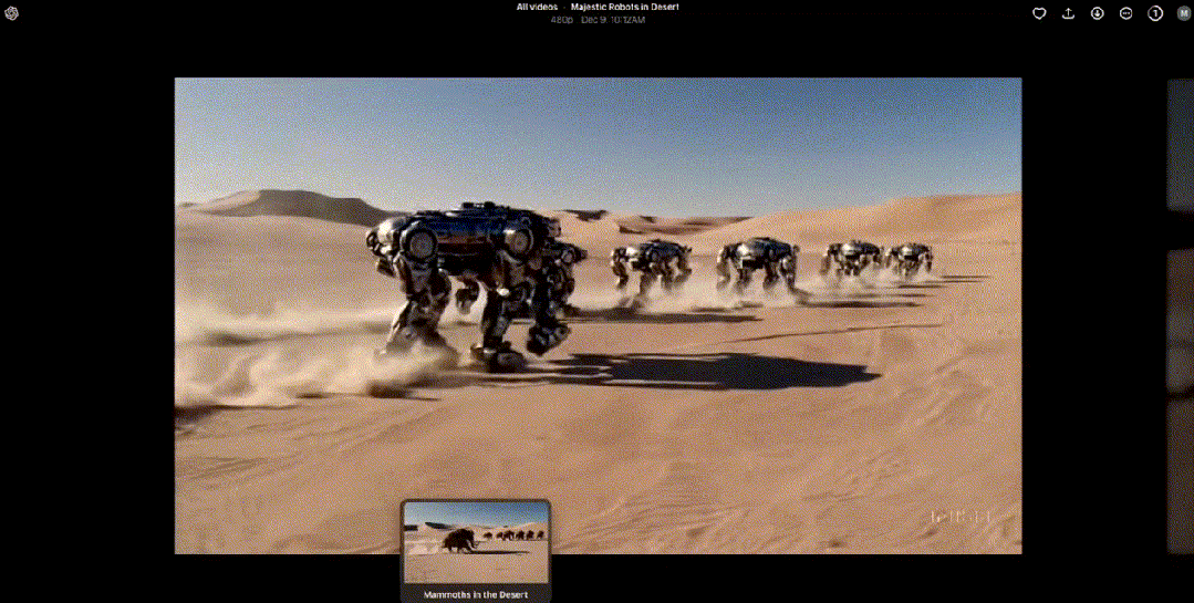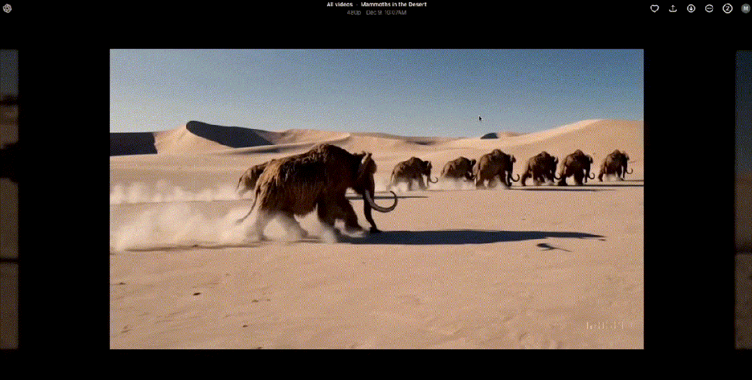 用 prompt“ 毛茸茸的猛犸在沙漠中行走 ” 生成一段视频,看起来也没啥特别的对吧。