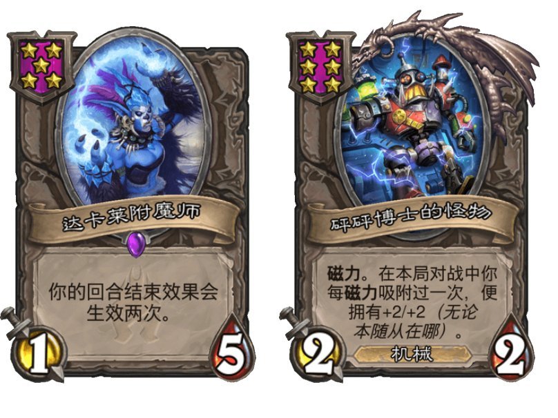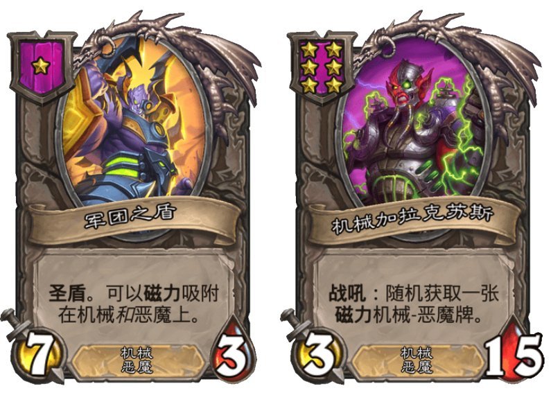 這一套是上賽季就有的玩法,利用小瞎眼觸發廢鐵殘械給場上隨從貼磁力,而銅須附魔師提供的高額觸發頻率,能夠提供大量磁力從而使六本磁力得到高速成長,這一套必須在六本玩,這樣六本磁力纔會出現在發現磁力的卡池中,從而實現身材的飛速成長。