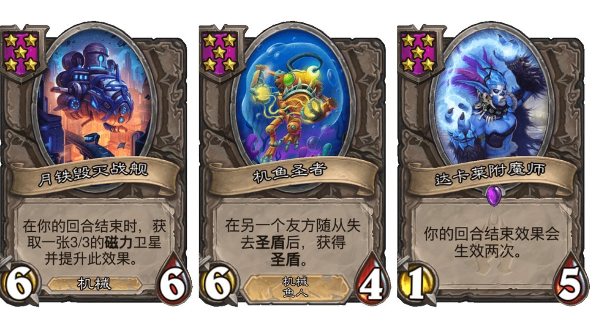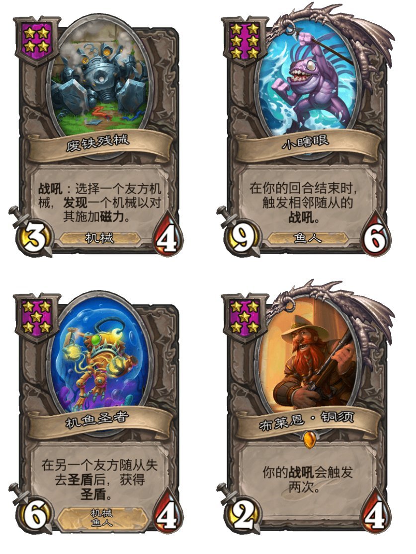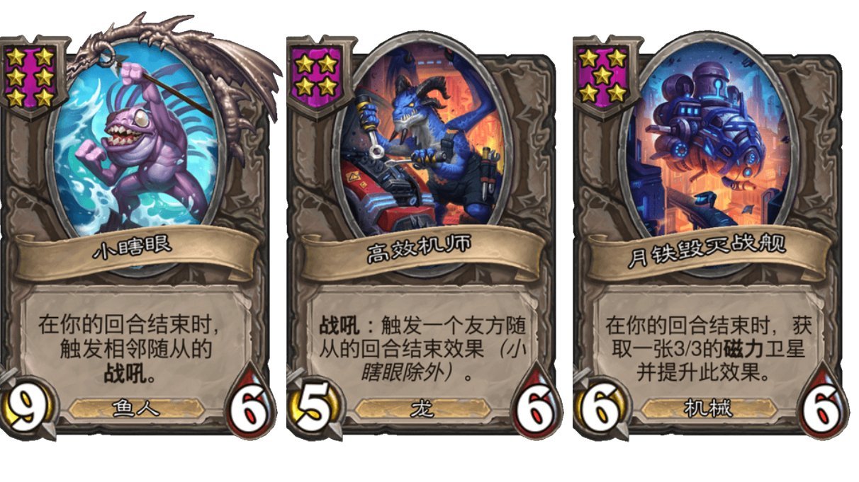如果場上有魚龍種族的話,那麼這個陣容的上限將被無限倍擴大,用小瞎眼觸發高效機師的戰吼,高效機師觸發月鐵,銅須和達萊卡增加觸發頻率,回合結束滿手磁力,並且月鐵提供的身材會以非常恐怖的速度增長,輕輕鬆鬆四位數身材。