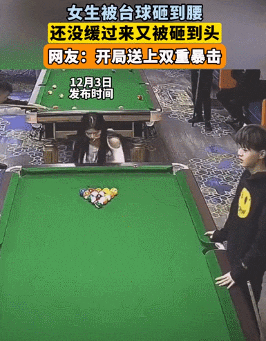 近日,廣西,女生在臺球室意外被檯球砸到腰,疼到蹲在地上,沒想到立刻又來一顆球砸到頭,直接就是Double kill。