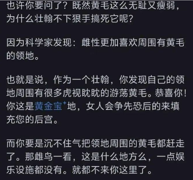 但有研究發現,雌鳥會更喜歡黃毛比較多的領地,所以直男鳥並不會驅趕黃毛。