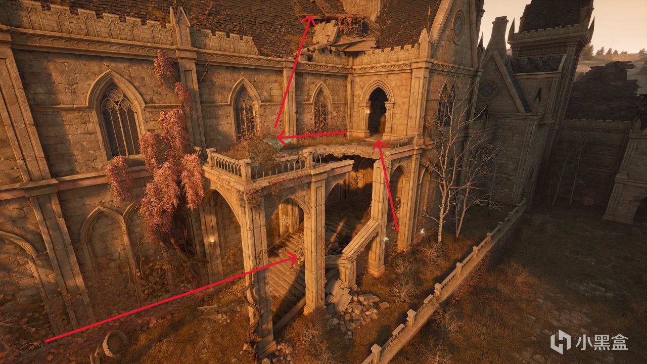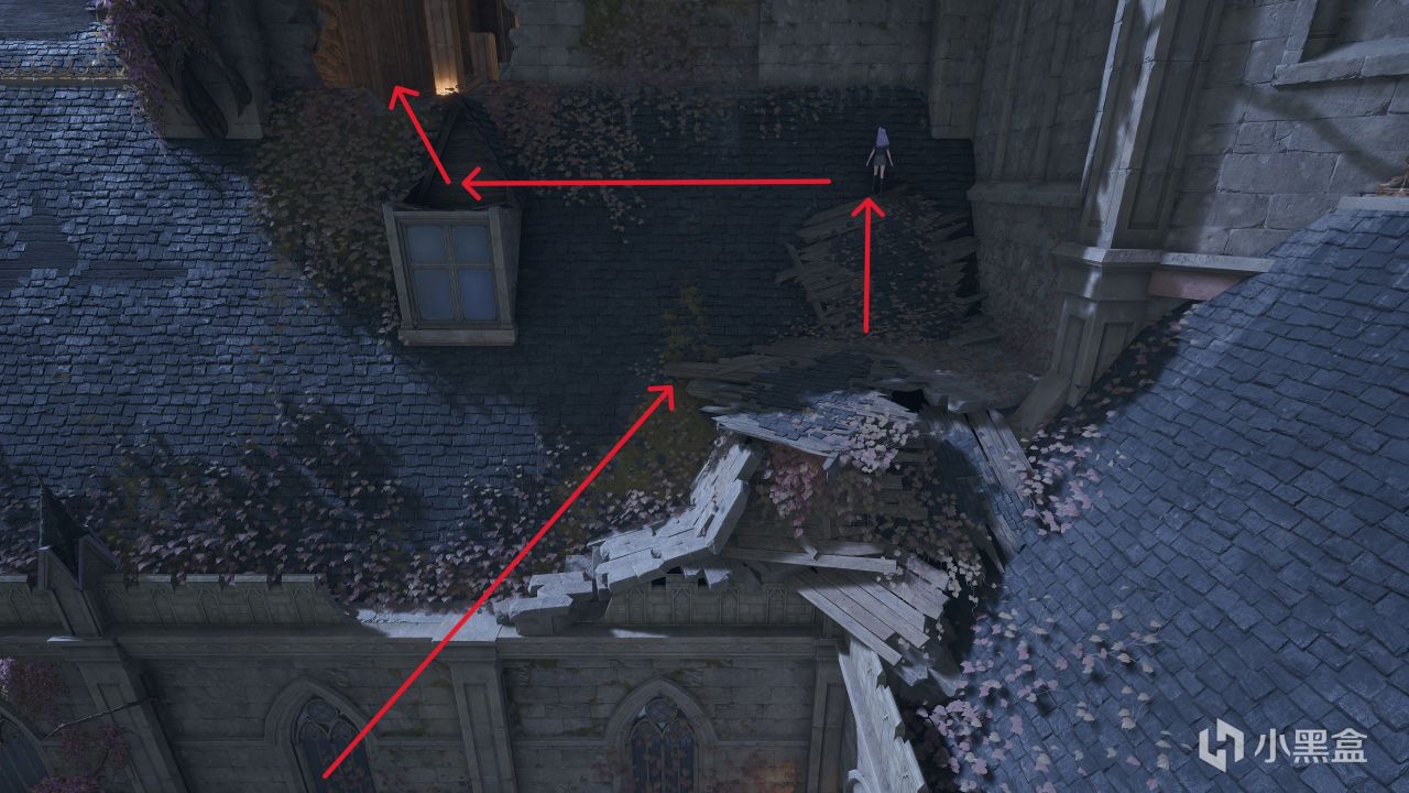 蹦上來之後,注意第二個箭頭那邊是可以踩上去的,踩上去之後就可以靠暖暖的漂浮能力飛過去了,傳送點就在進入後沿着破敗的樓梯往上走就能看見了