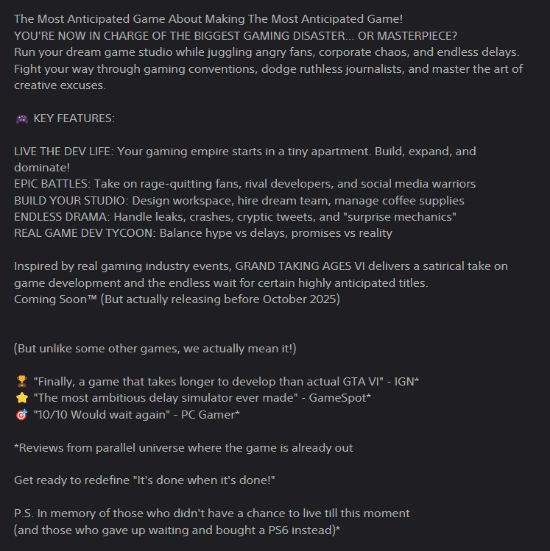 我們此前曾報道,最近有一款名爲《Grand Taking Ages VI》的遊戲在PS商店上架,其簡介也較爲有趣,寫道:“在這款遊戲中,你將經營夢想中的遊戲工作室,同時面對憤怒的粉絲、公司混亂和無盡的延期。穿越遊戲展會、躲避無情記者,並掌握創造性藉口的藝術!”