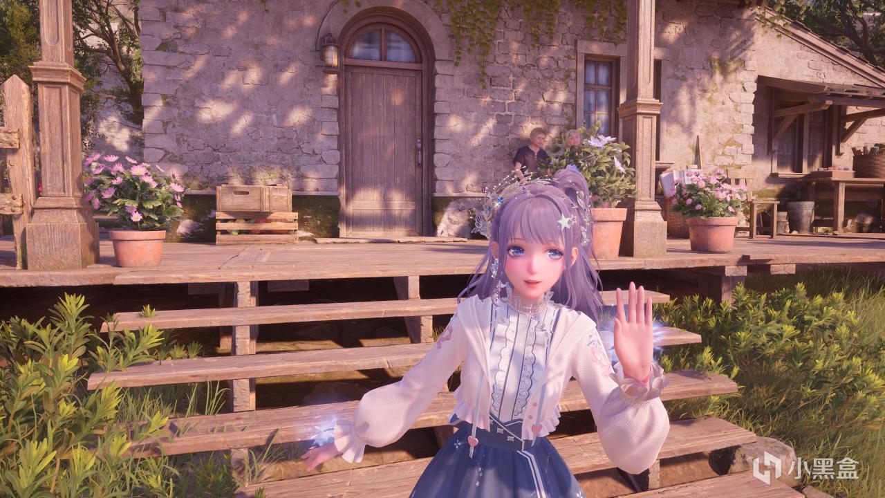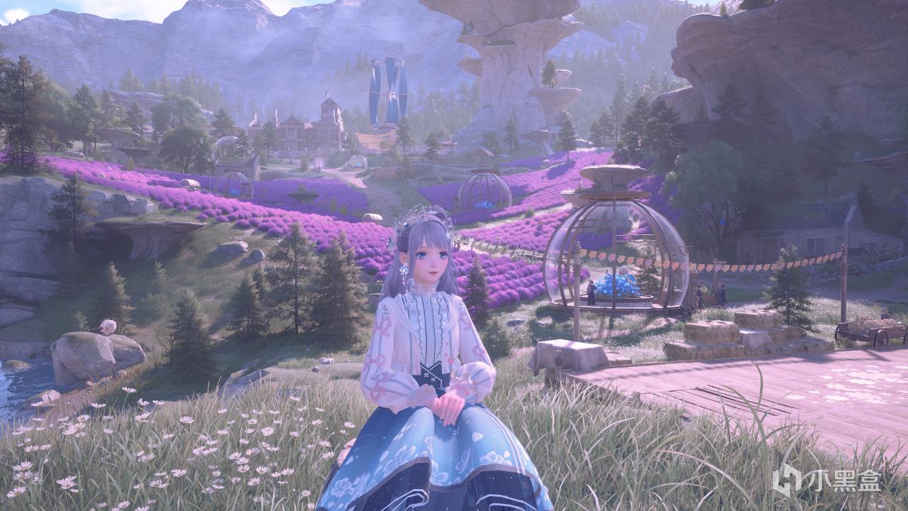 就在一大片紫穗草花田的高坡上的屋子前面,需要拍攝到門口坐着的老人