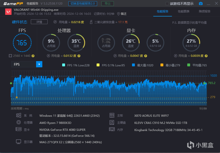 《无畏契约》测试,平均帧率765,0.1%Low帧95,同样是装备和准备界面帧率偏低,最高帧率1020,千帧游戏不是未来了!鹅厂网游对硬件要求确实低,优化相当到位。