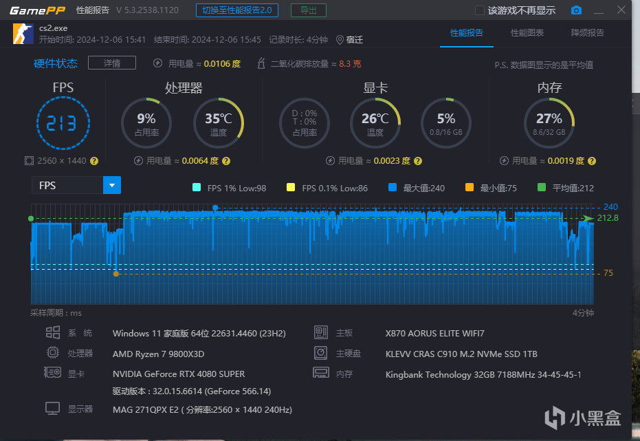 《CS2》测试中,平均帧率213,0.1%Low帧86,实际游戏中没有感觉到任何帧率波动,可能是游戏选装备界面帧率较低。