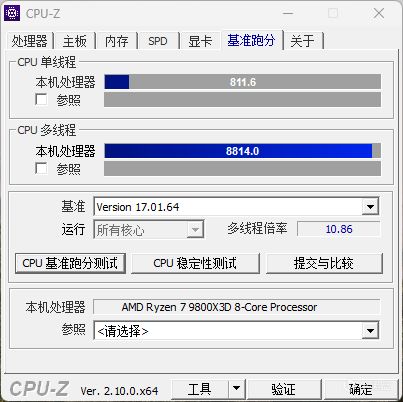 首先CPU这边,在技嘉主板中开启PBO,核心频率解锁5.4GHz,CPU-Z中单核成绩811,多核成绩8814,相比未解锁PBO跑分提升约4%。