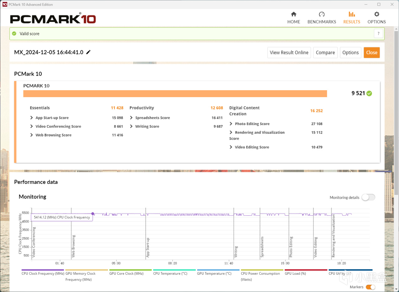 PCMARK10测试中,总得分9521,Essentials得分11425,P roductivity得分12688,Digital Content得分16252。
