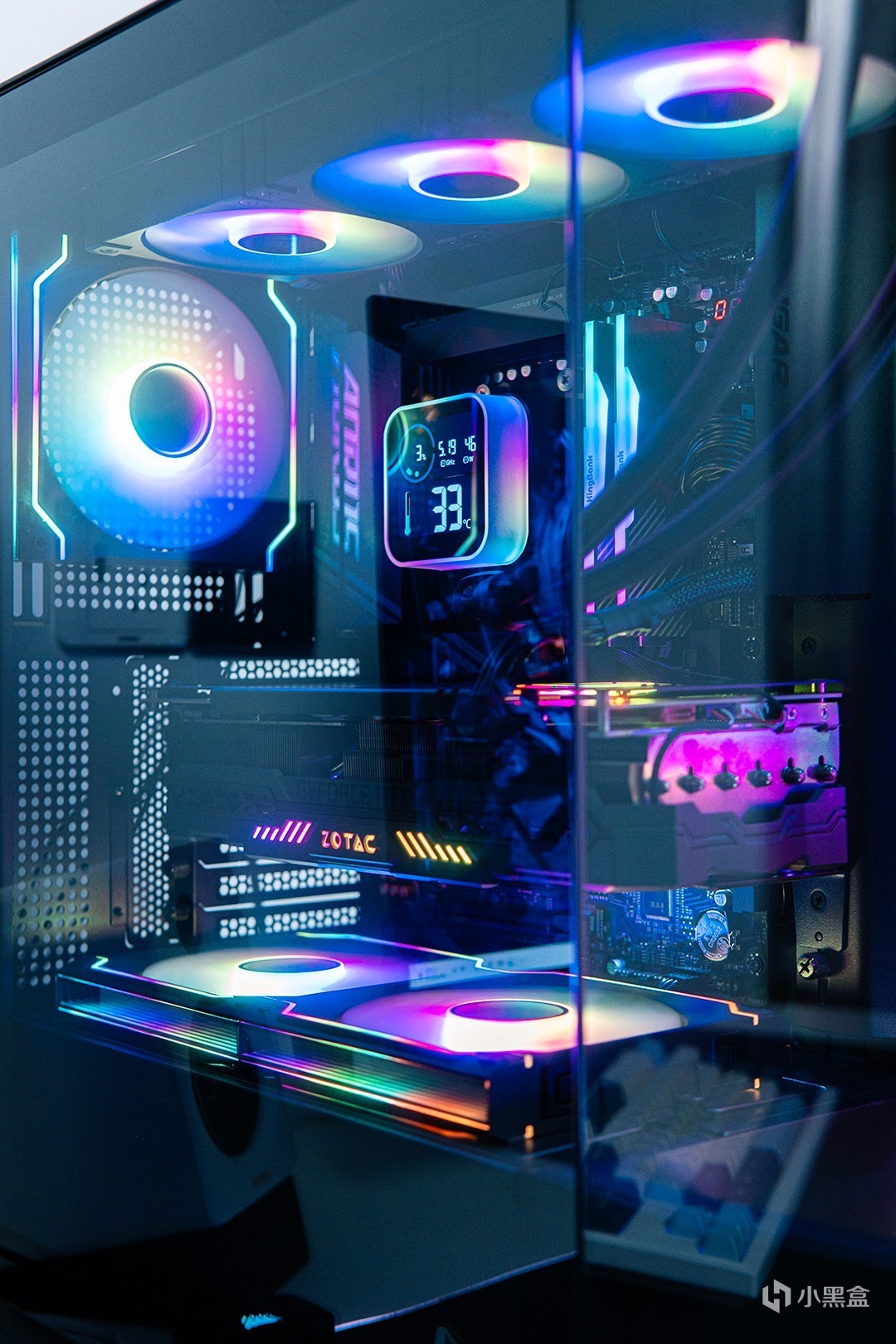 索泰RTX 4080 SUPER 16G PGF OC的RGB灯区也非常多,我这里横向安装,风扇面有点看不到,如果是竖装或者是斜装,颜值会更高。