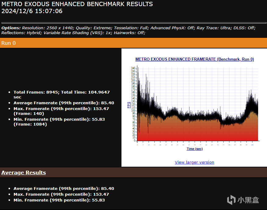 《地铁:离去》测试中,画质Extreme,光线追踪Ultra,DLSS关闭,平均帧率为85,最低帧率为55.83,火焰燃烧的场景会有一些波动感,建议开启DLSS。