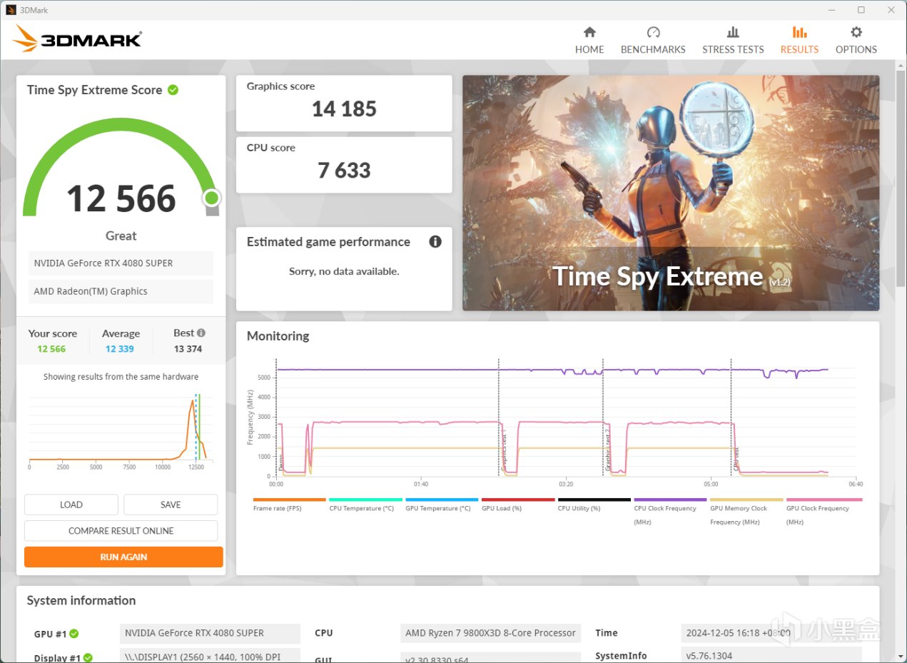 3DMARK TimeSpy Extreme测试中,总得分12566,图形得分14185,CPU得分7633。