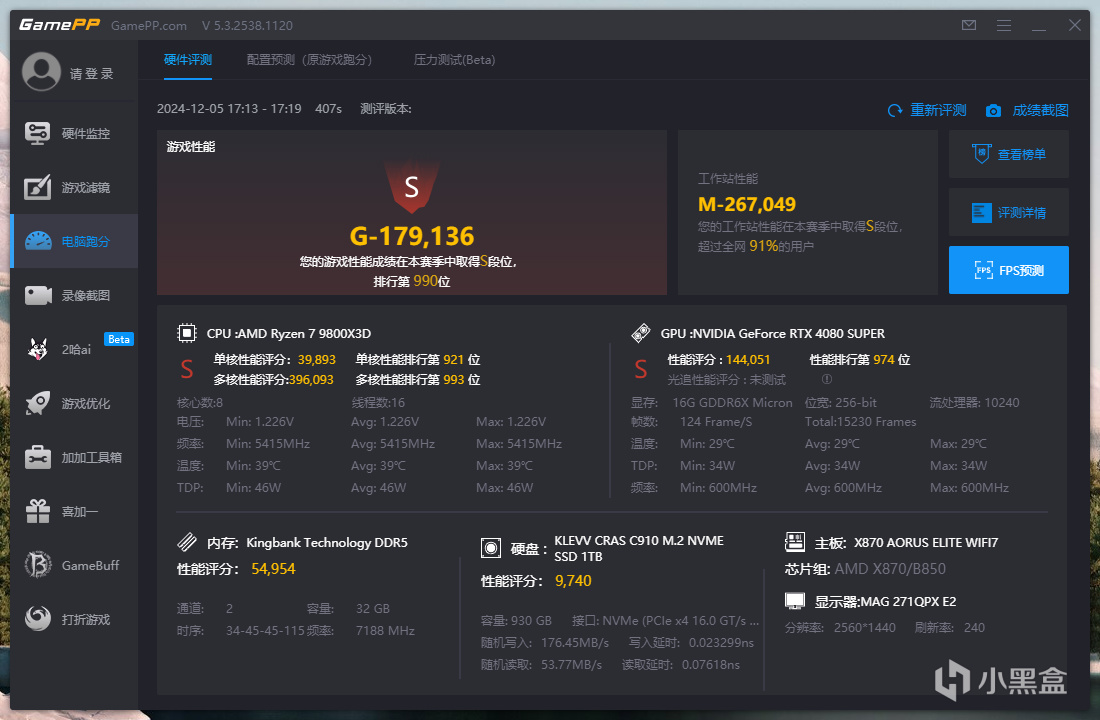 使用Game加加测试,整机得分179136,处于S段位,工作站性能得分267049,属于S段位,9800x3D单核得分39893,多核得分396093,索泰RTX 4080 SUPER 16G PGF OC性能得分144051。