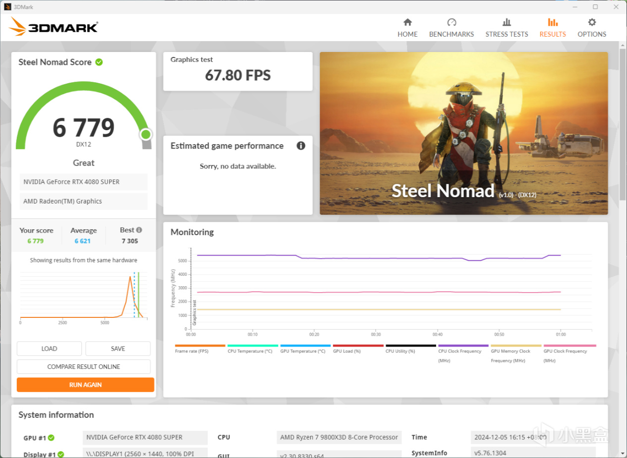 3DMARK Steel Nomad测试,总得分6779,平均帧率67.8。