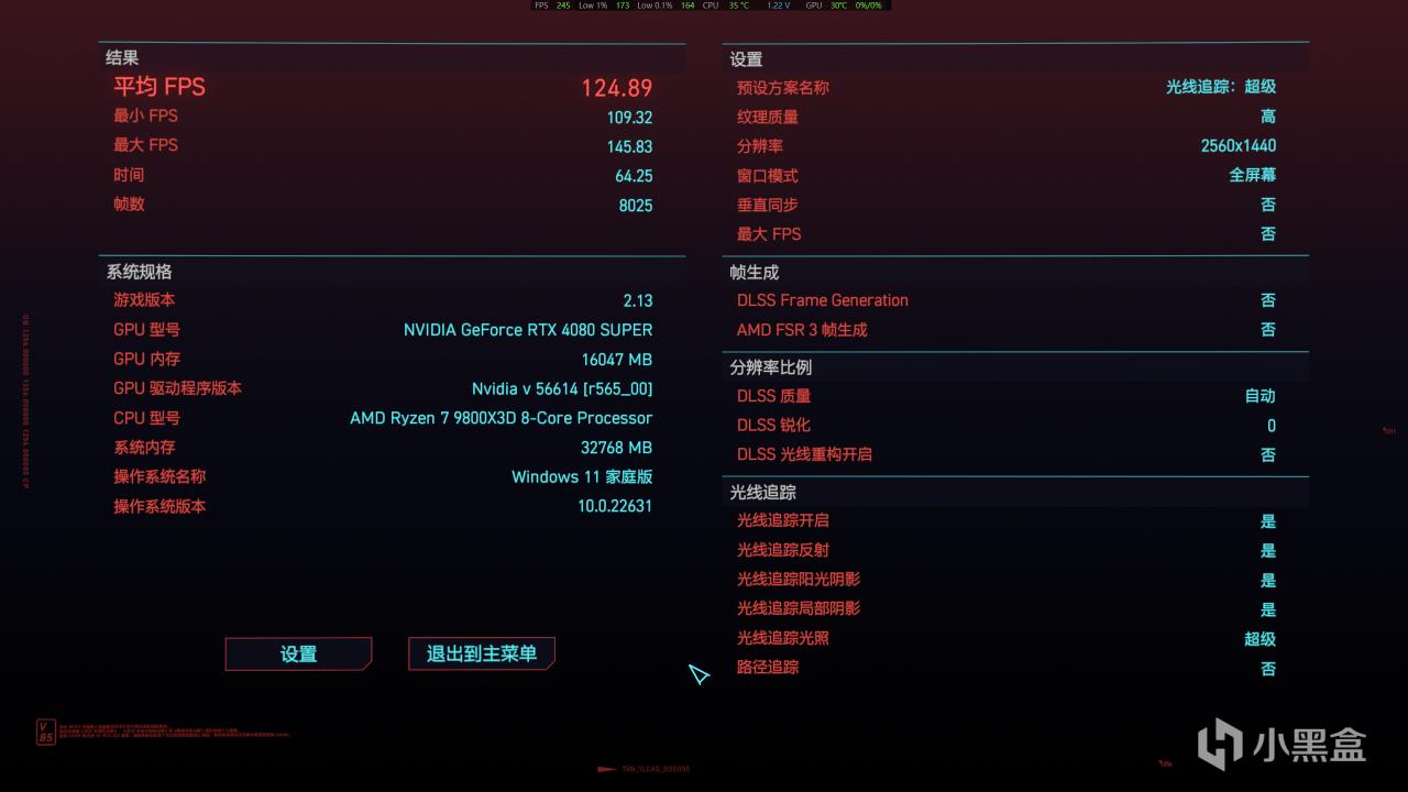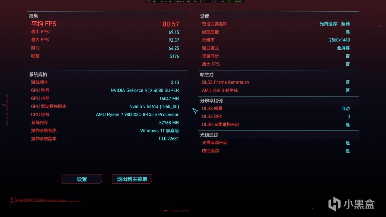 《赛博朋克2077》作为显卡杀手,光线追踪:超速模式下,9800x3D+4080S帧率仅80.57帧,好在最小FPS为69.15,算是流畅运行,稍微降一档画质到光线追踪:超级,平均帧率就提升到124.89,提升幅度有50%,光线追踪还是太吃性能了。