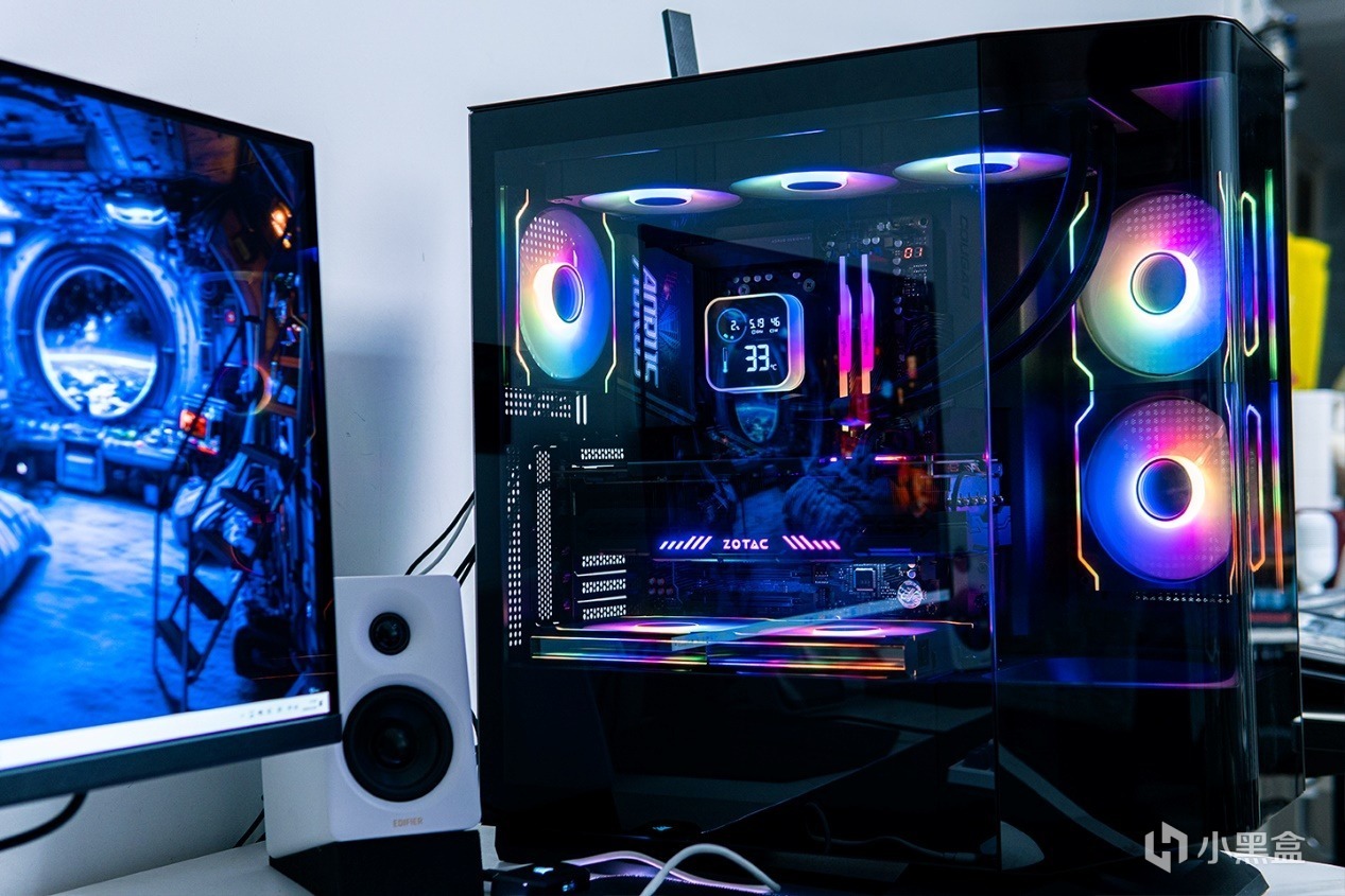 机箱这边使用的是骨伽星舰FV270,曲面玻璃和海景房确实更搭,颜值没得说,机箱内部最多可以安装9个风扇,我这里安装了5个星链积木风扇,多区+无限镜ARGB,颜值相当棒。