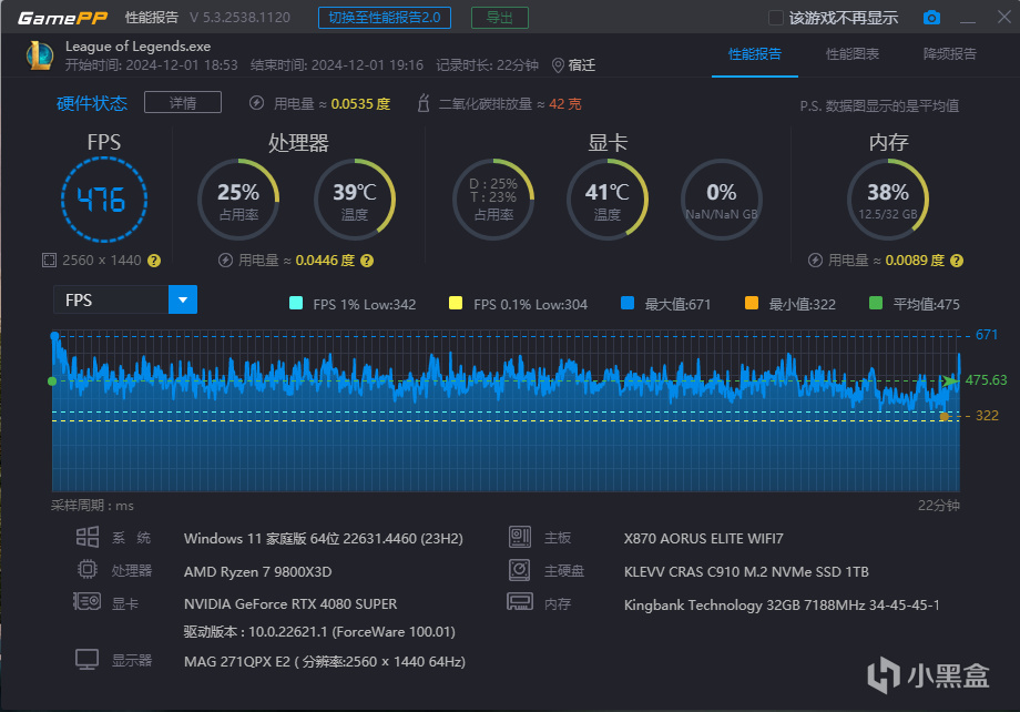 《英雄联盟》测试中,平均帧率476,0.1%Low帧304,最高帧率671,压力不大。