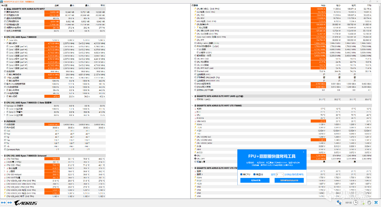 双烤测试中,9800x3D单核跑满4.7GHz,温度71摄氏度,功耗约136W,索泰RTX 4080 SUPER 16G PGF OC温度约61.6摄氏度,功耗约320W,总体温度不高,性能释放充分。