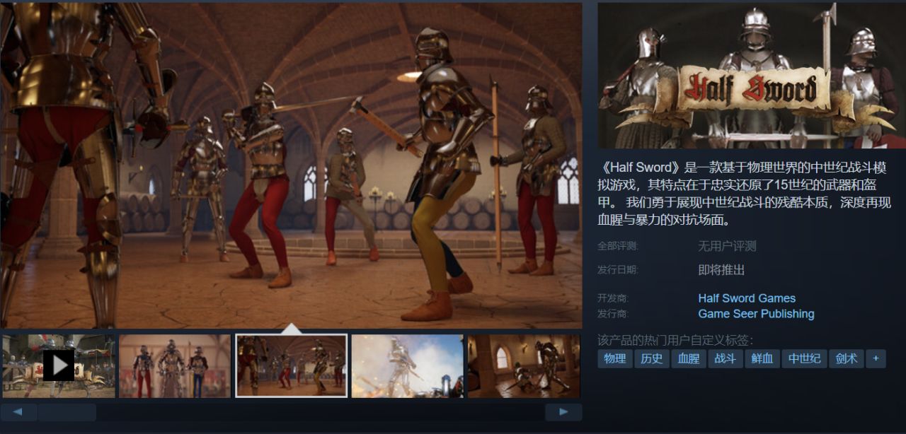 其實作爲一款基於物理的戰鬥模擬遊戲,《Half Sword》甚至在測試版本就已經展示出了自己在劍術戰鬥這個賽道上的巨大潛力,相似的遊戲《Exanima》雖然有着劇情驅動,但是在戰鬥上可能不及《Half Sword》更有沉浸感;而《蠢蠢角鬥士》雖然在多人模式上做的更好,但總感覺像是個派對遊戲,武器和盔甲也欠打磨